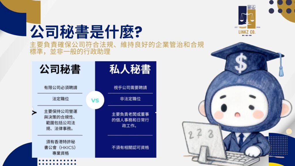 香港法例規定,每家有限公司必須委任最少一位公司秘書。公司秘書是現代企業制度中的一個法定職位,其職責為安排會議、準備會議紀錄、提交法定檔給政府部門、確保公司符合法定要求等。