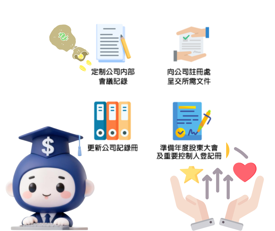 有秘書服務,可處理大量行政工作,包括處理一些基本文件,記錄公司的變更,以及管理股票和公司股份轉讓等事項。由外判秘書公司負責一切秘書工作,可令公司必能遵循商業慣例來經營之同時,也必定符合法律要求。